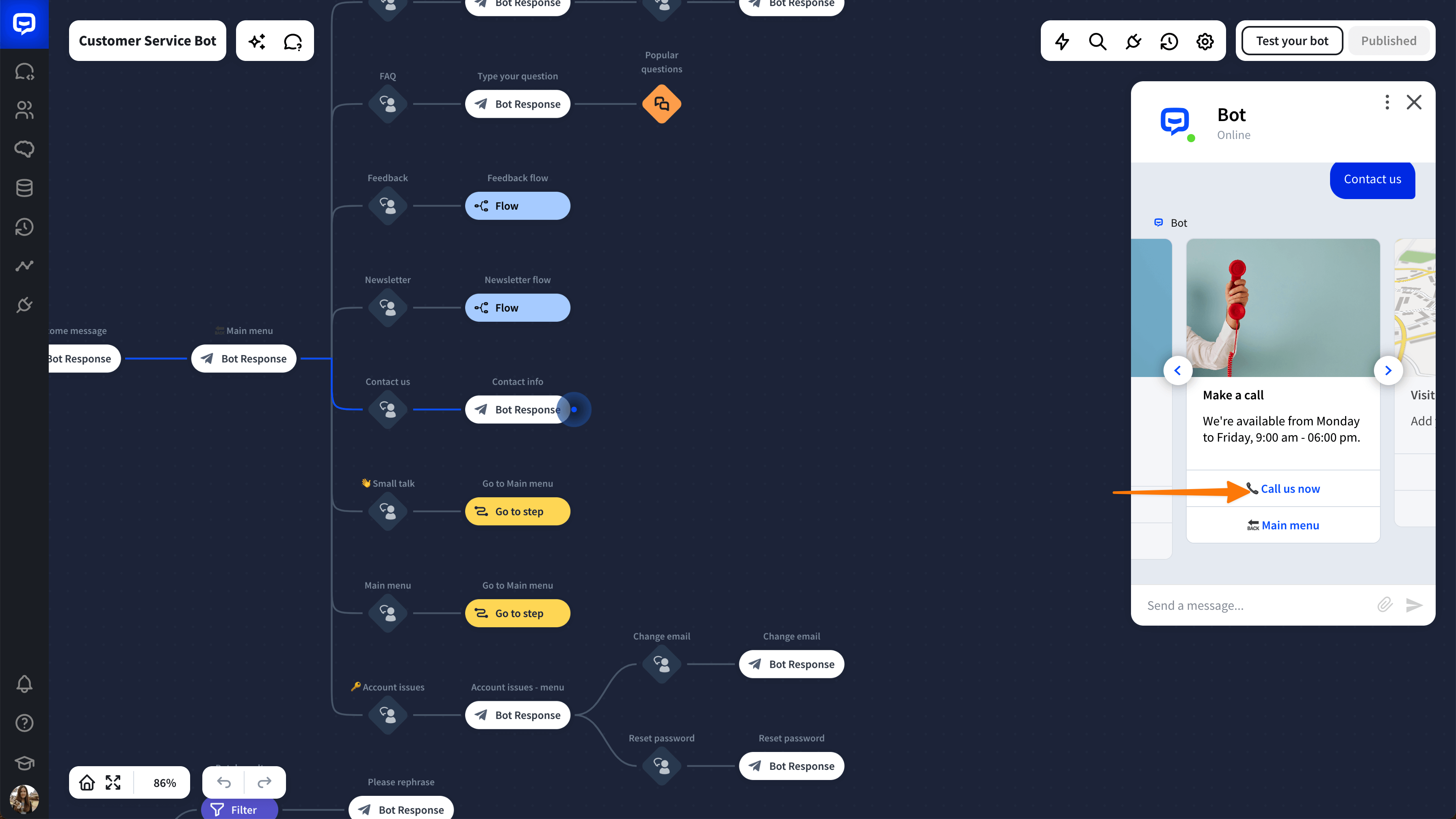 Help customers navigate the most important sections of your website, promote your products, and collect feedback. You can also use the template to share discounts or coupon codes with users who sign up for your newsletter via your chatbot.