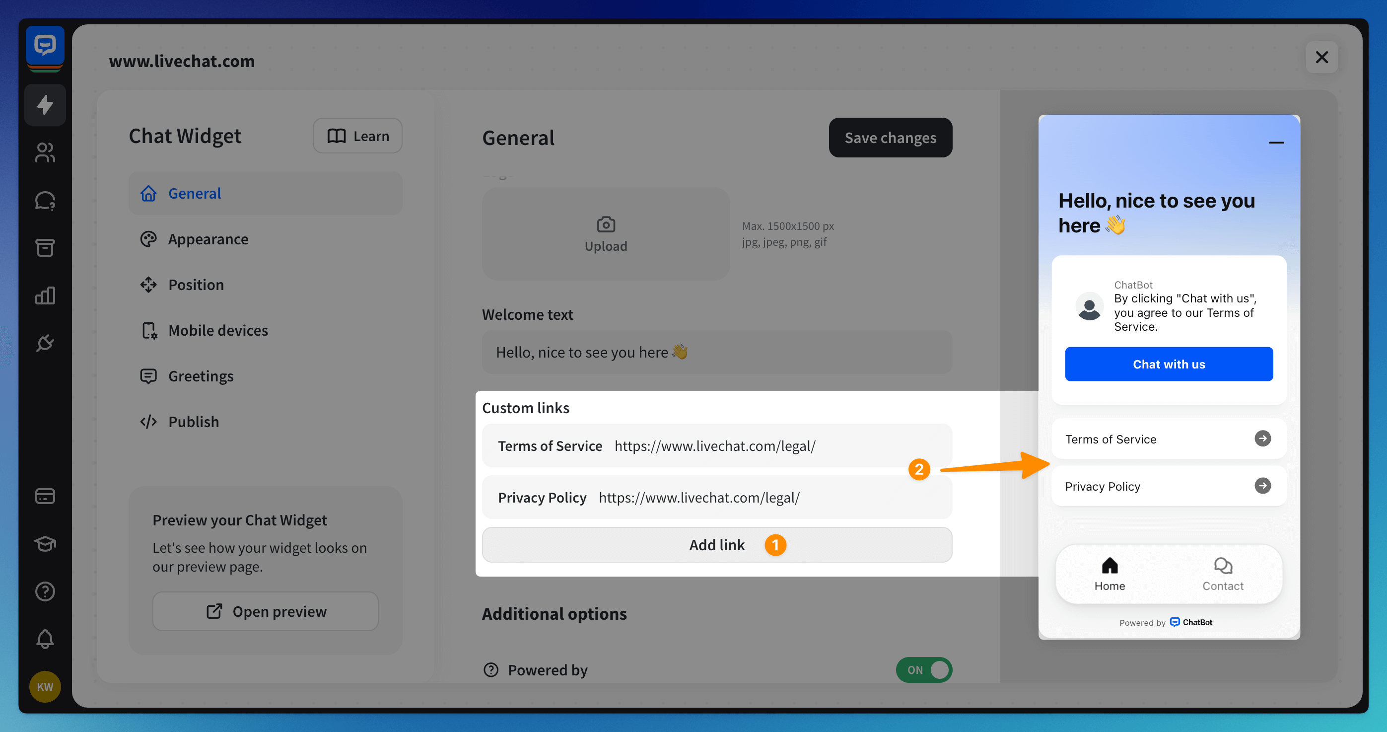 4. Additionally, you can link to your Terms of Service/Privacy Policy/Other legal document by clicking on the + Add link button and defining the link’s URL and title.