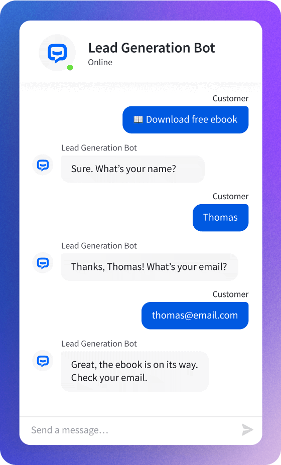 The platform can automate both text communication with your customers and internal workflows with a team in your organization. You can easily install a smart bot on your website to automate chats, generate leads, and create other workflows for customer service. For internal operations, embed a digital assistant on your company's internal website or Slack channel to communicate with your team at scale and automate repetitive tasks.