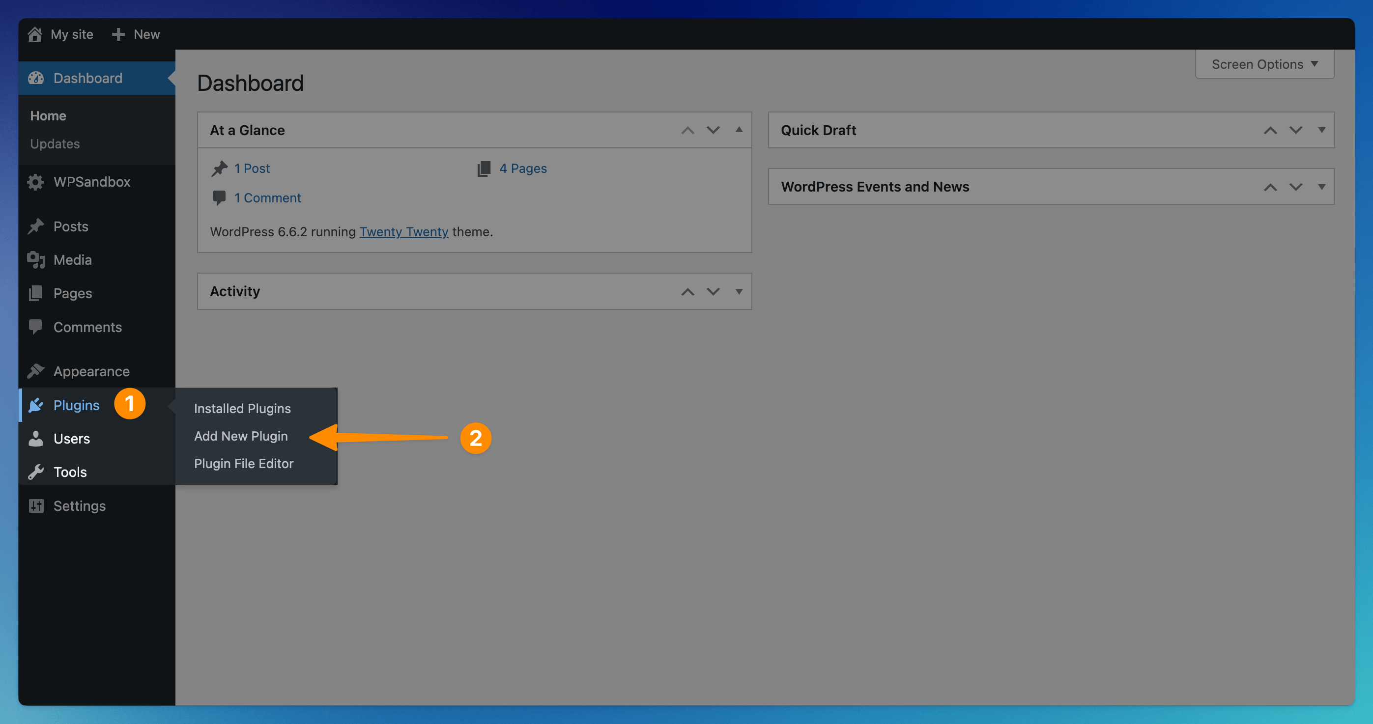 In your WordPress Dashboard, click on the Plugins (1) section and choose Add New Plugin (2) from the list.