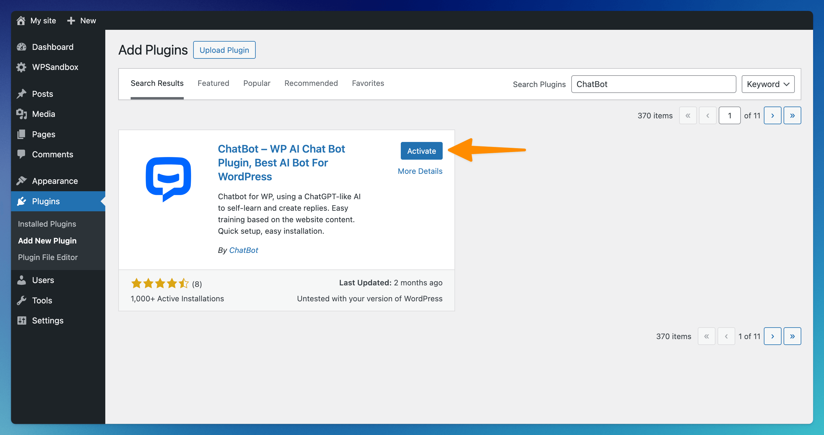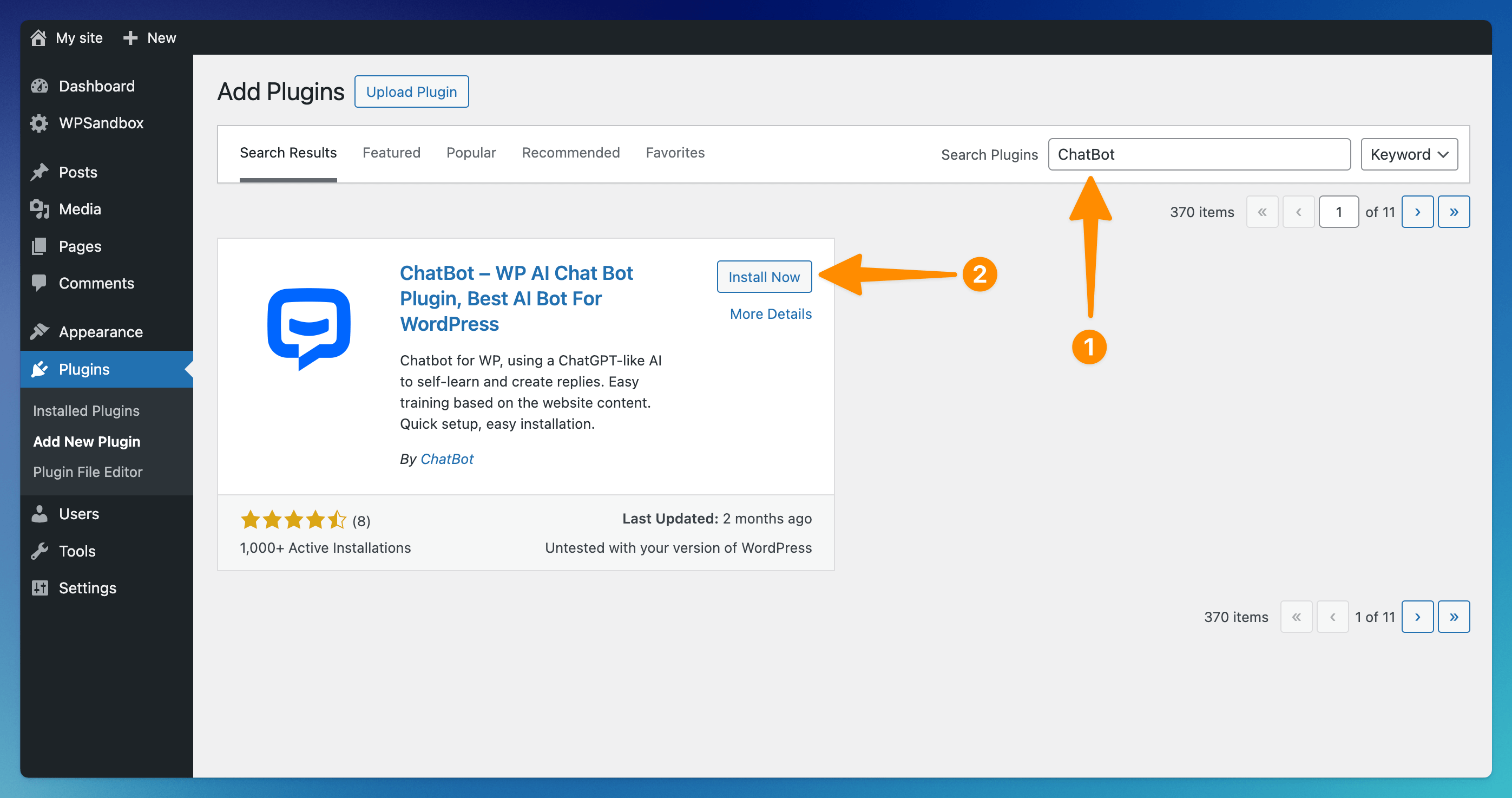 Type ChatBot in the search bar located on the right (1). Find ChatBot.com – WP chat bot plugin for WordPress on the list, and click on Install Now (2) to proceed.