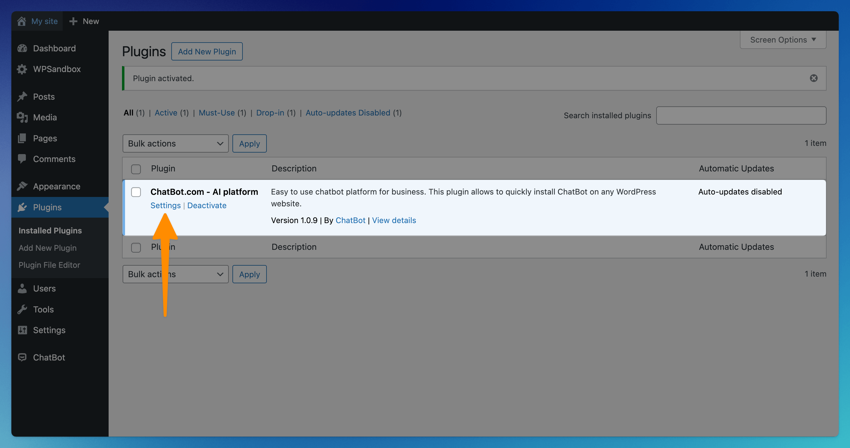 You will be redirected to the Plugins section in your WordPress. Click on the Settings button available under the ChatBot.com plugin.