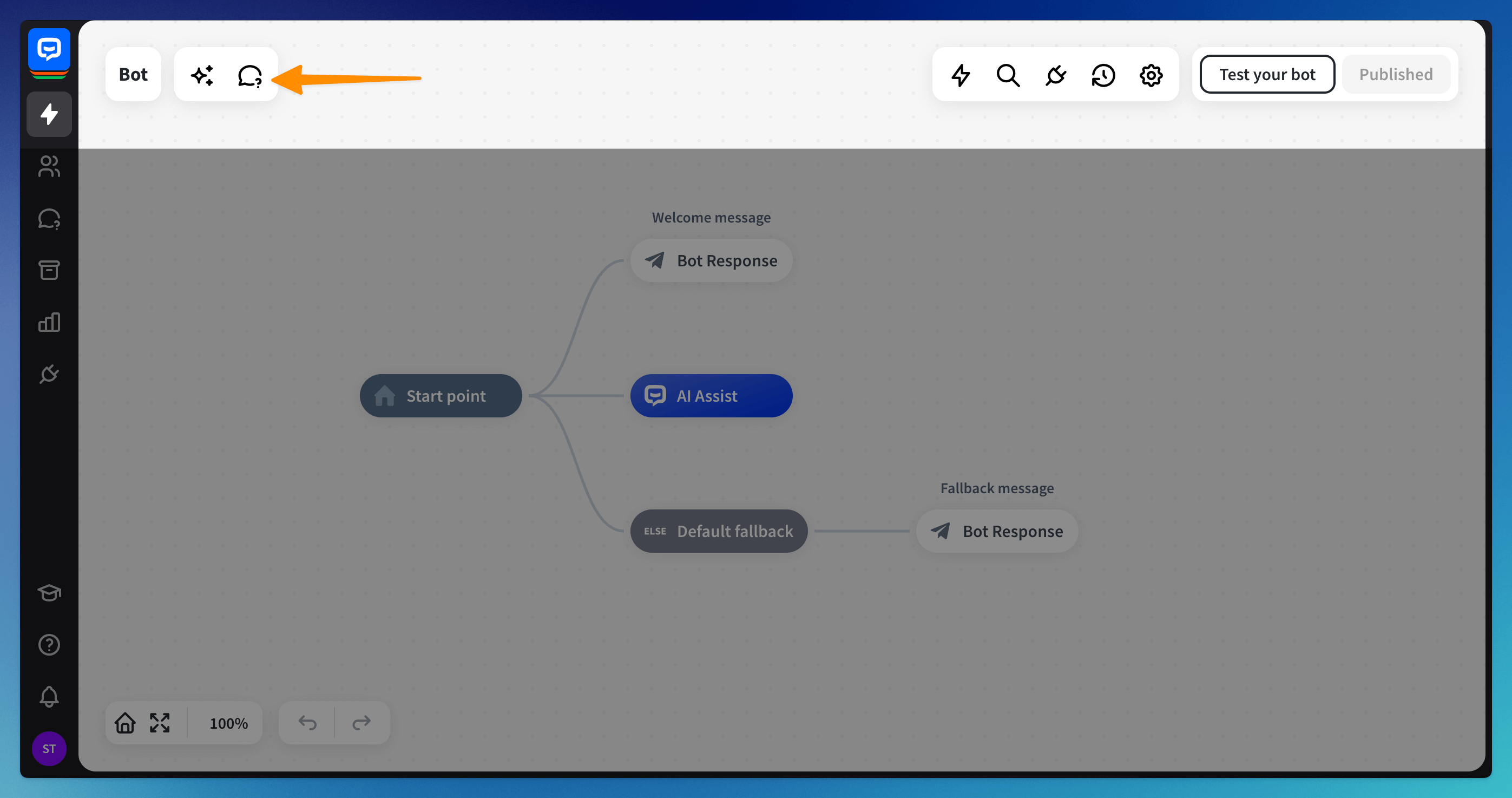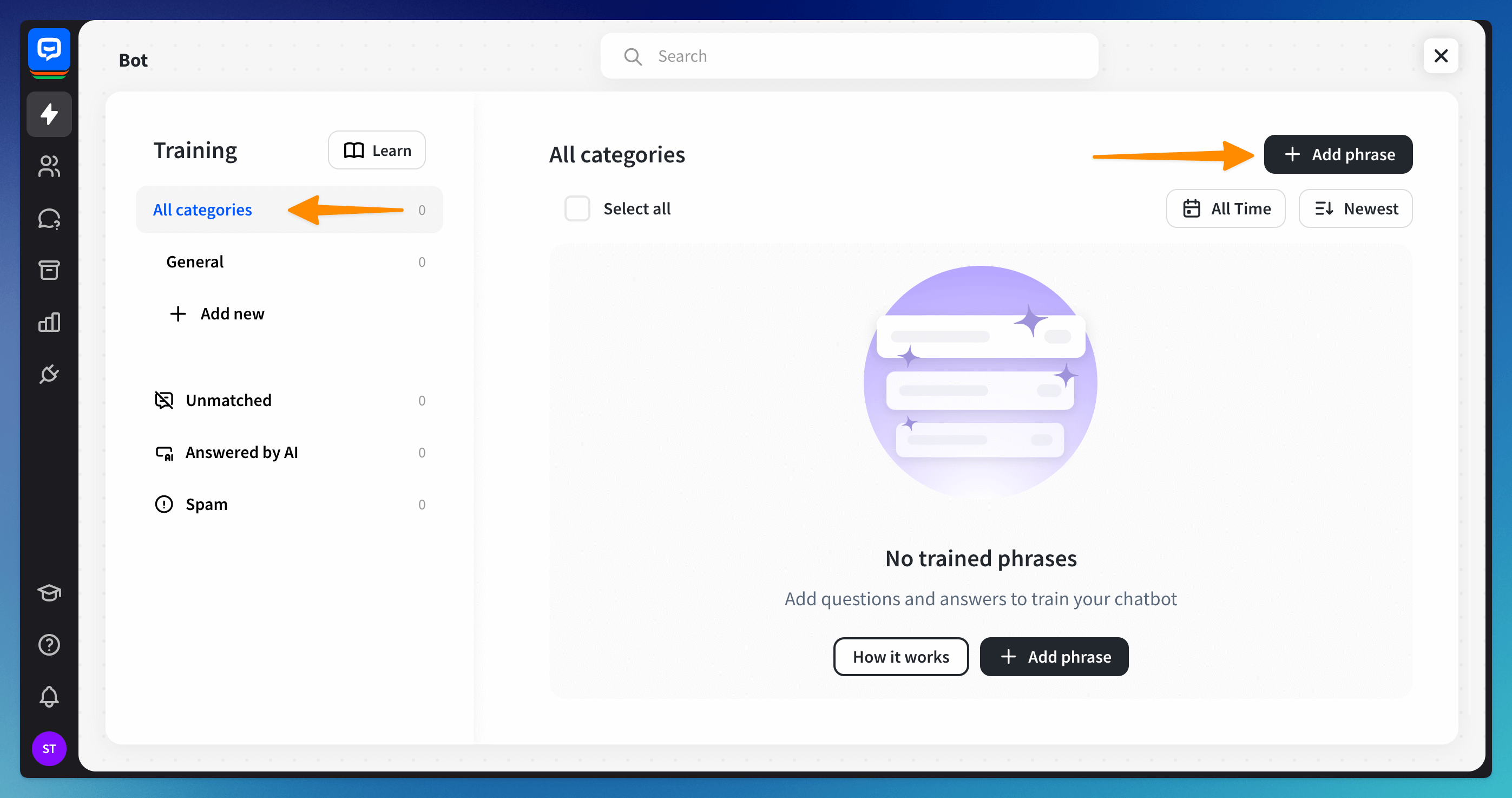 The AI Training module is located at the top left of your screen, in the main view of your chatbot. You can use it to train your chatbot. This section will be empty if you are just starting with the bot training.