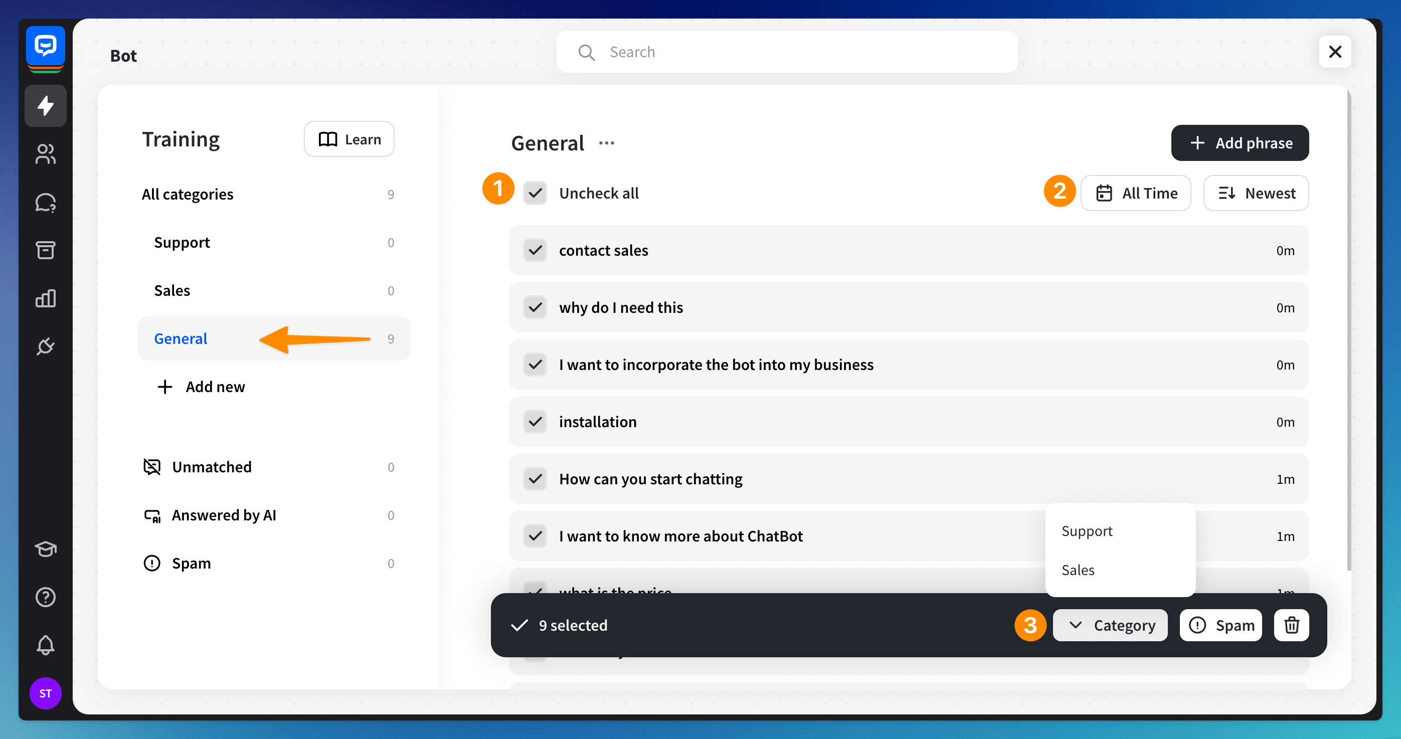 You can select the phrases in bulk (1), filter them and sort by newest or oldest (2), change their category, add them to spam, or delete them (3).