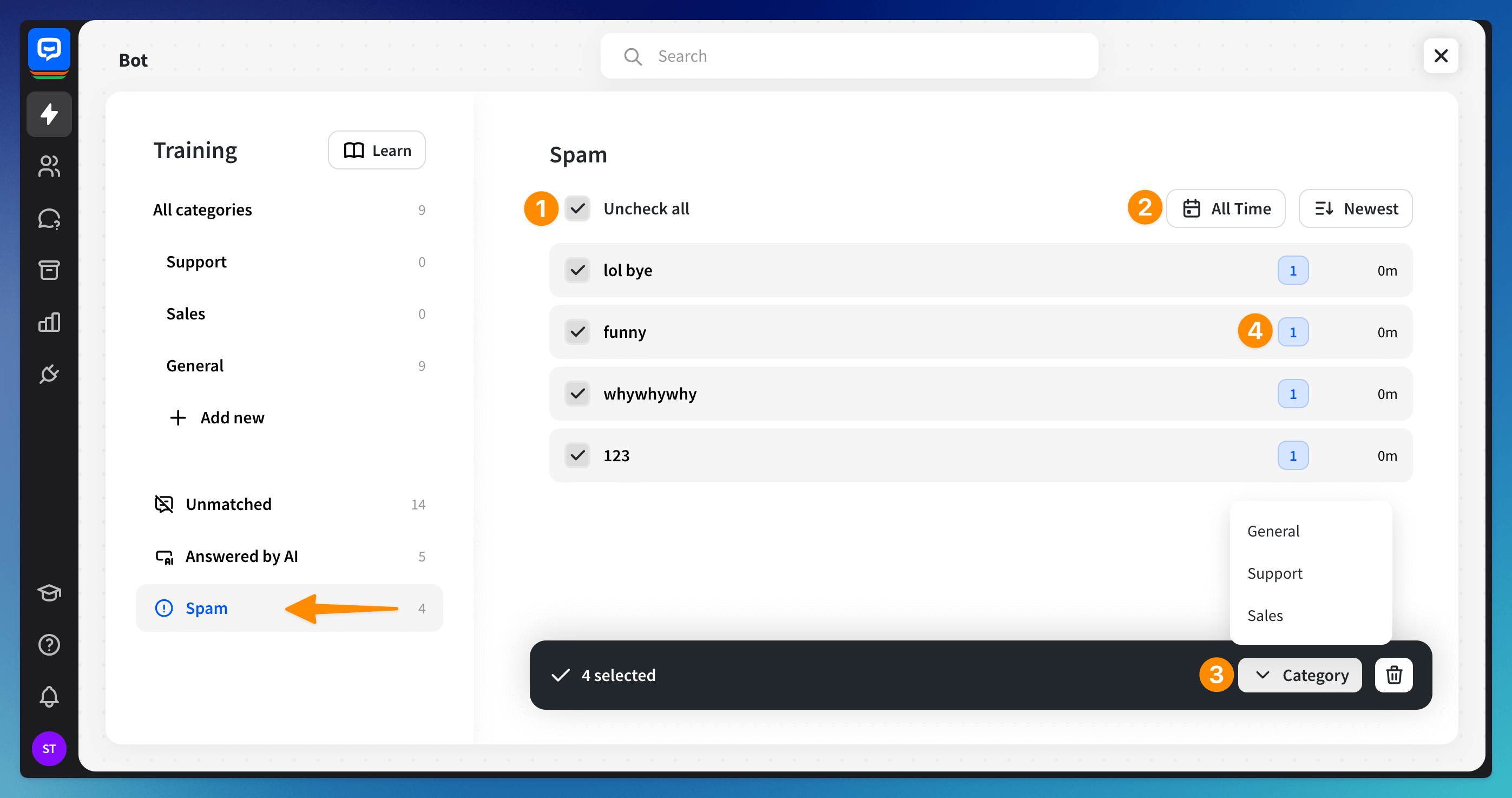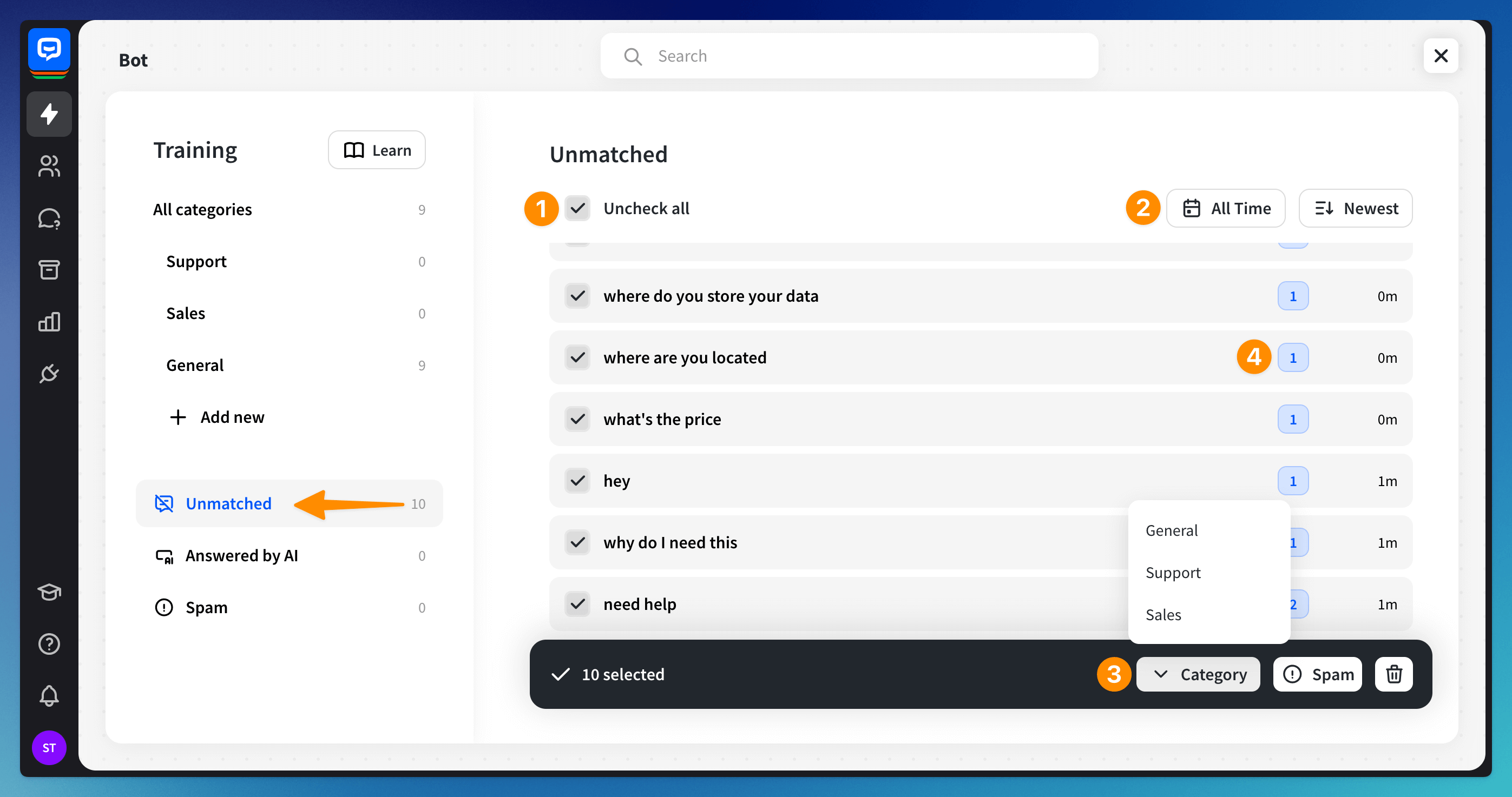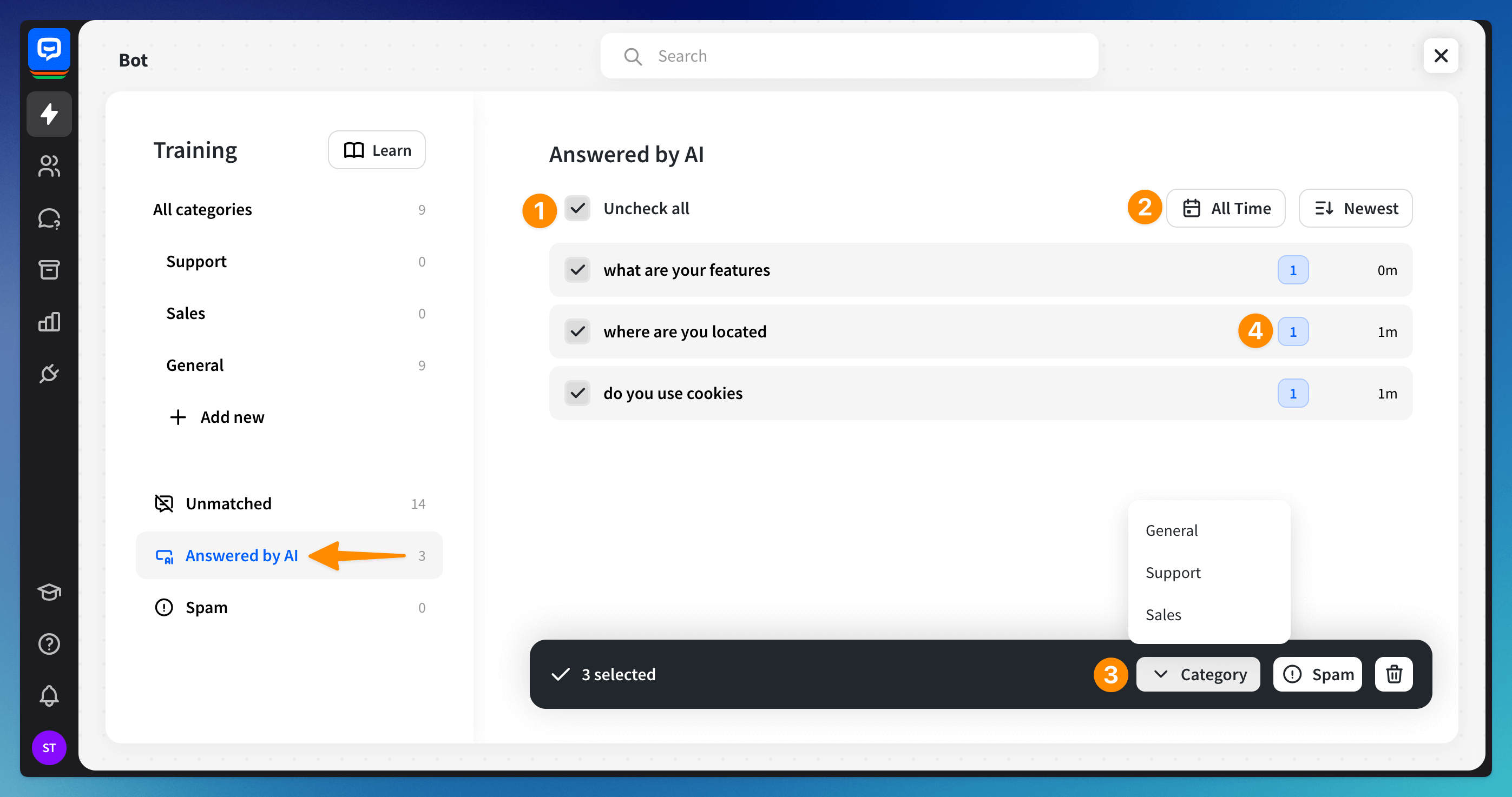 To use this section effectively, view and edit answers by improving responses. Select questions in bulk (1), filter and sort them (2), add them to categories, spam, or delete them (3). You can also see how many times each question was asked (4). These steps can refine the AI’s responses and enhance its performance over time.