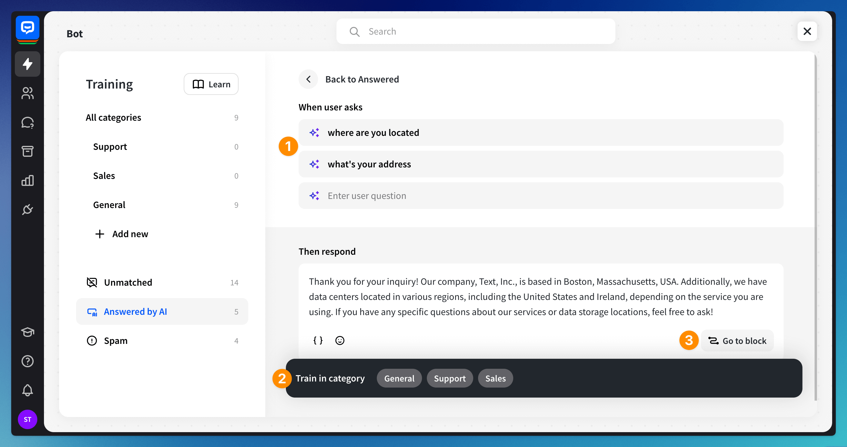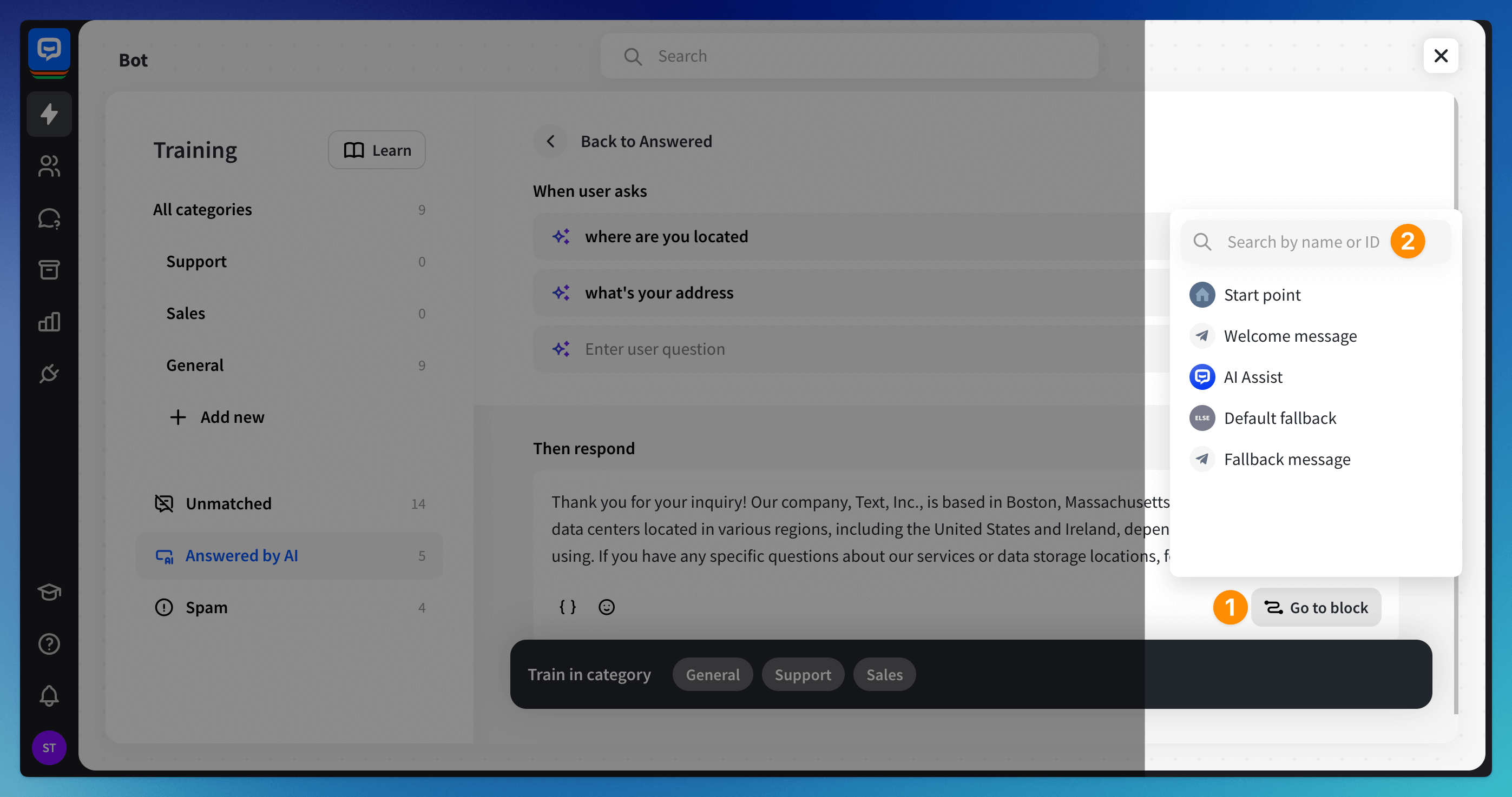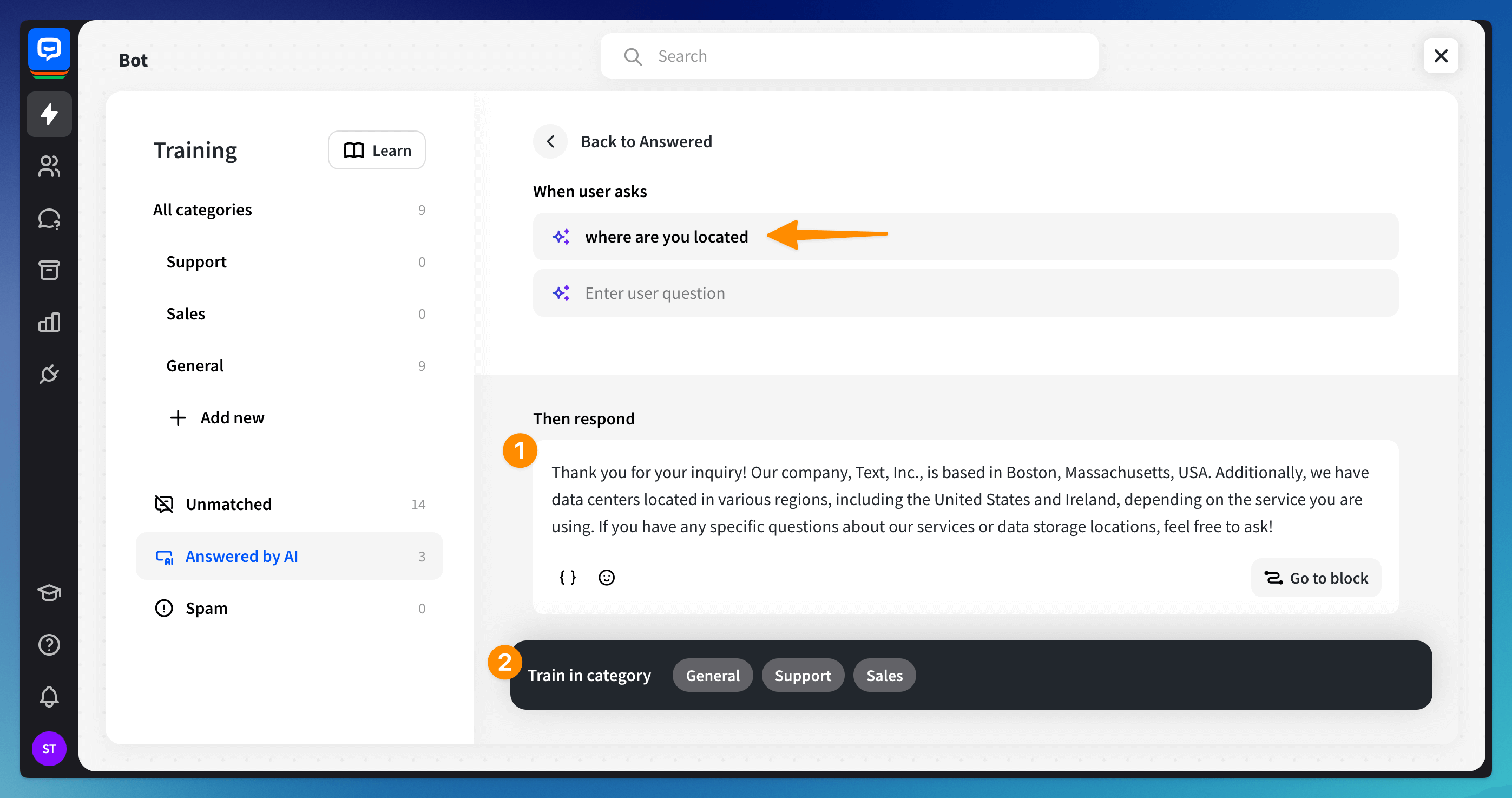 To fine-tune AI-generated responses, browse through them and click on a specific entry to edit it. You can edit the bot’s answer (1) to improve its accuracy and add the edited entry to a selected category (2) in the Training section.